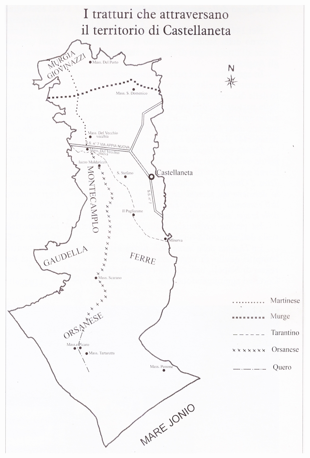 Le greggi si spostavano attraverso tratturi e tratturelli, larghi rispettivamente 111 metri, i primi e dai 18 ai 37 metri, i secondi. A Castellaneta, dopo 142 chilometri finiva il tratturo che, partendo da Melfi, passava per Spinazzola e Gravina; diramazioni di questo grande tratturo erano i tratturelli Martinese (Castellaneta-Crispiano-Grattaglie-Avetrana), Tarantino (Castellaneta-Palagiano-Grottaglie) che coincideva con il tracciato della via Appia antica. Nel territorio a sud di Castellaneta passavano i tratturelli Orasene-Dei Pini, Delle Ferre, Palagiano-Bradano, Quero e Pineto. (5)